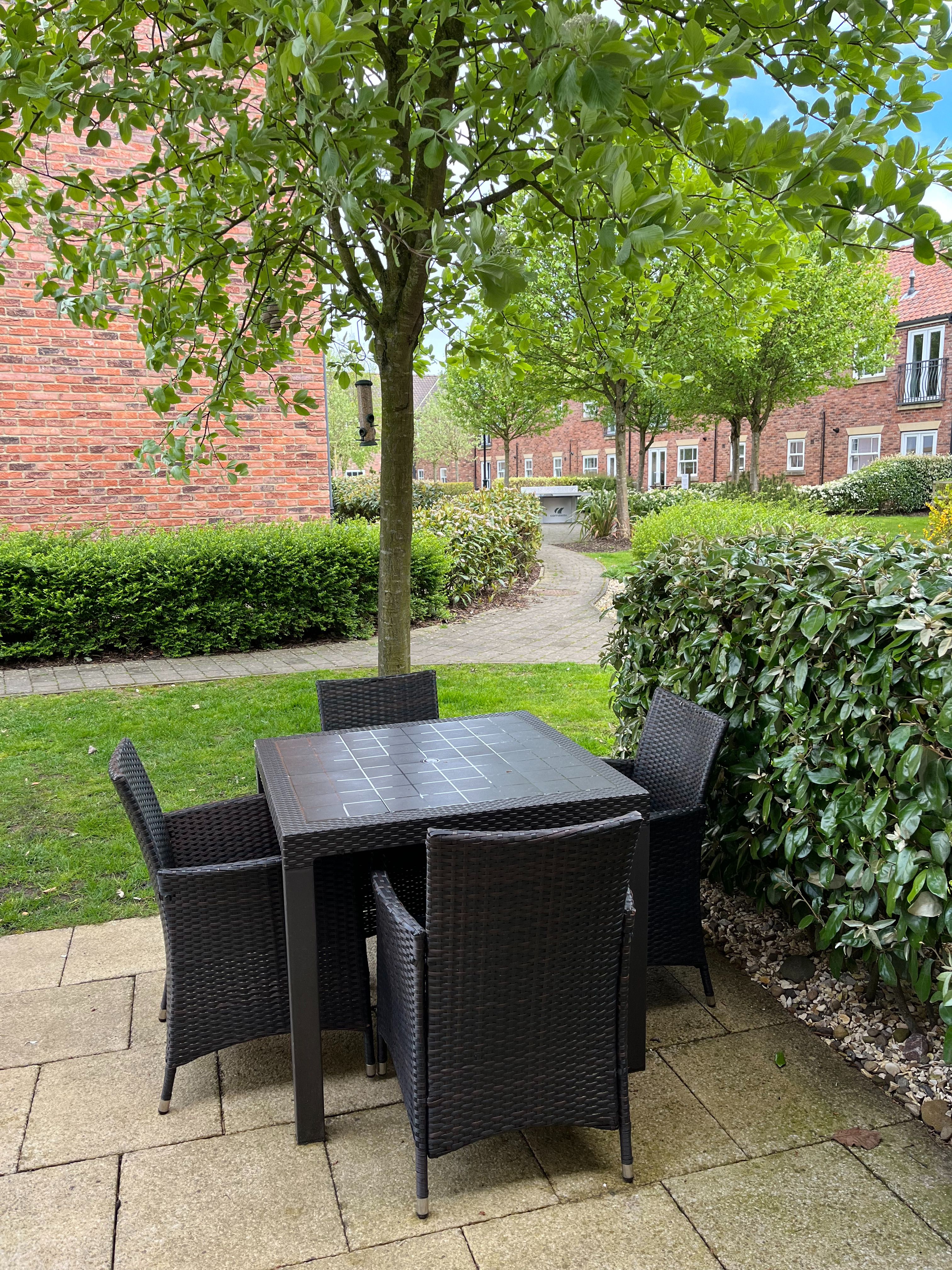 Outside is a patio with table and chairs, a brick-built BBQ and access to a courtyard with outdoor table tennis.