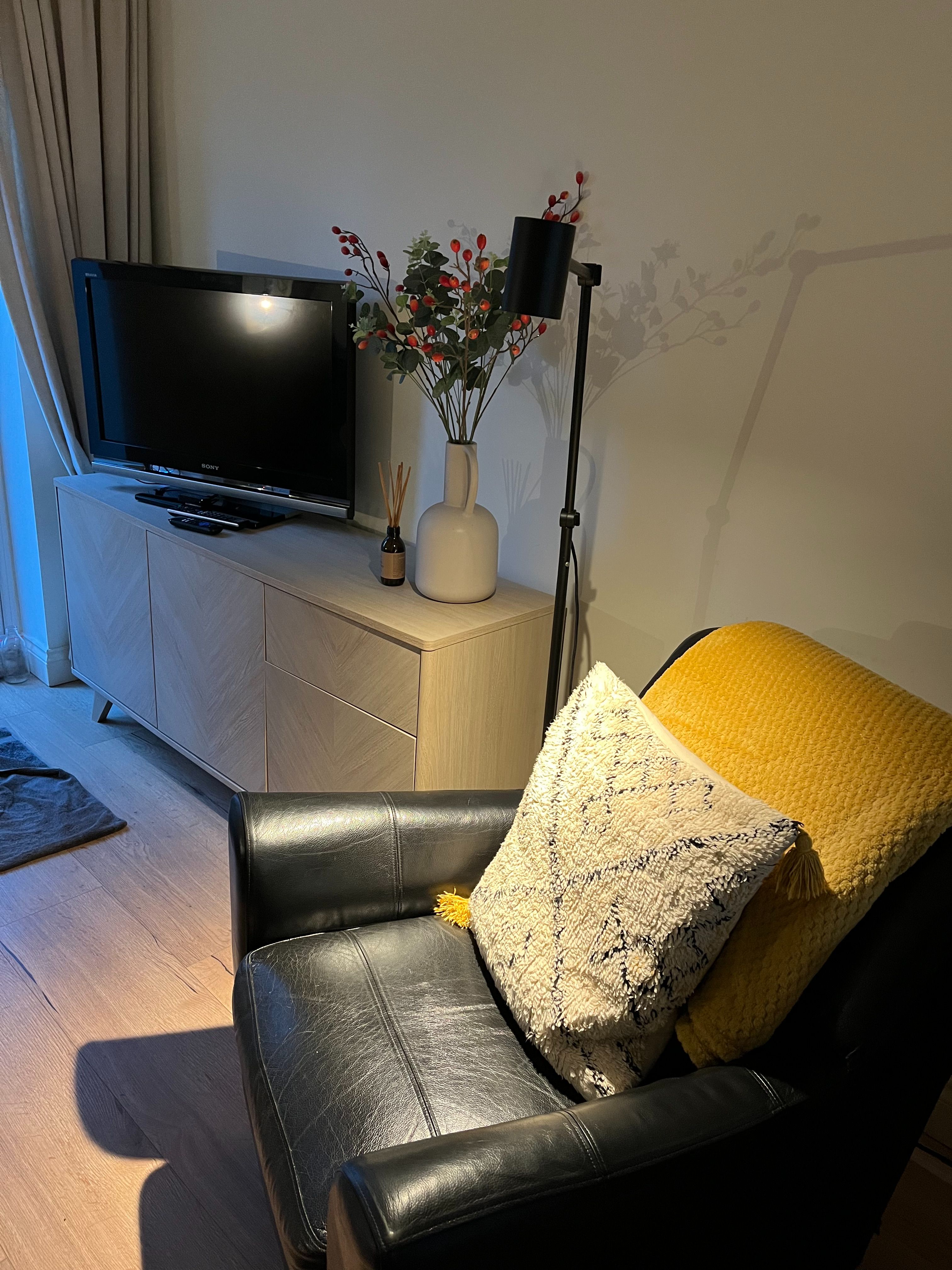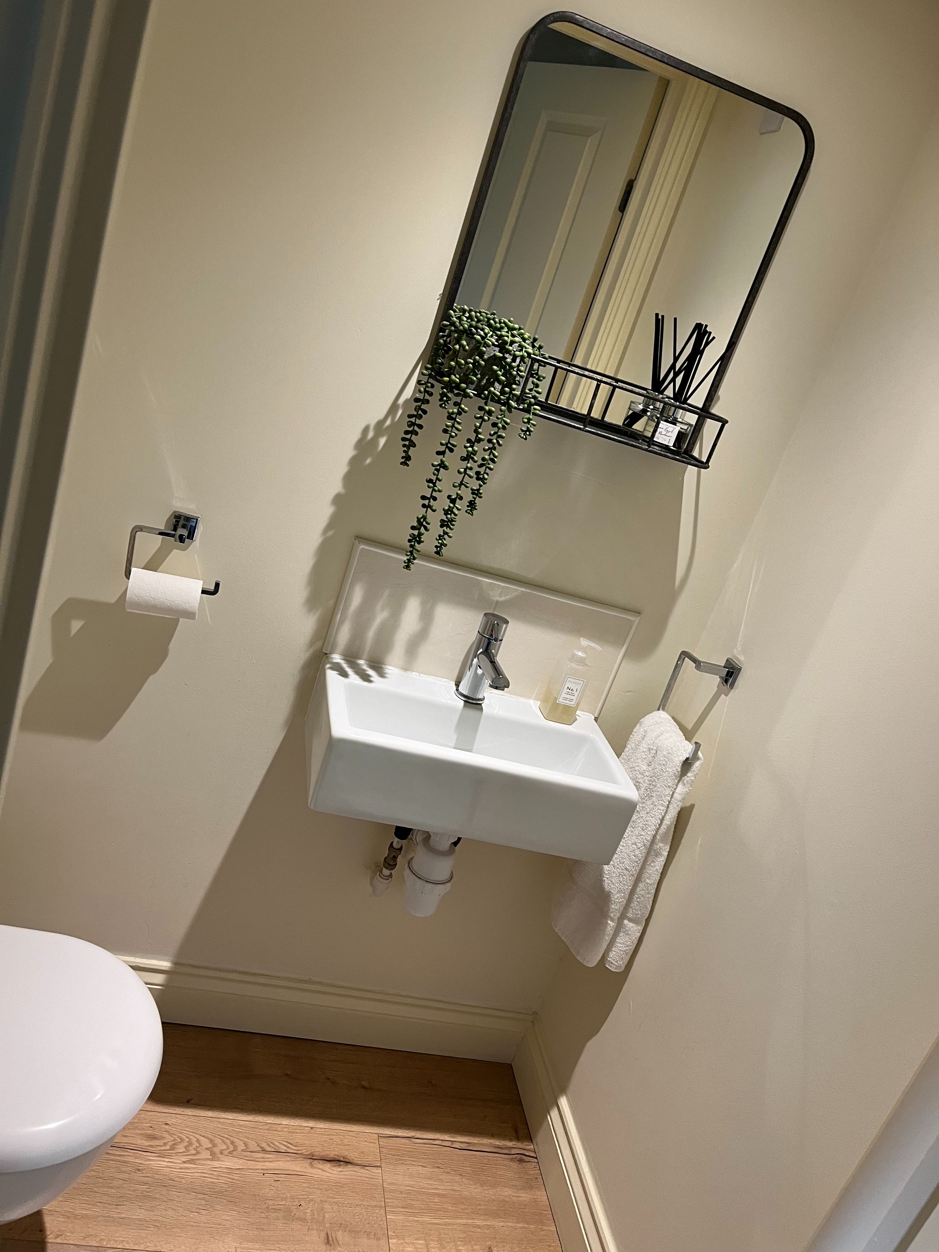 One bedroom has a double bed and the other two single beds. The double bedroom has a TV. The bathroom has a large airing cupboard which stores an iron, ironing board, clothes airier, travel cot, cordless vacuum and highchair. A hair dryer is also provided.